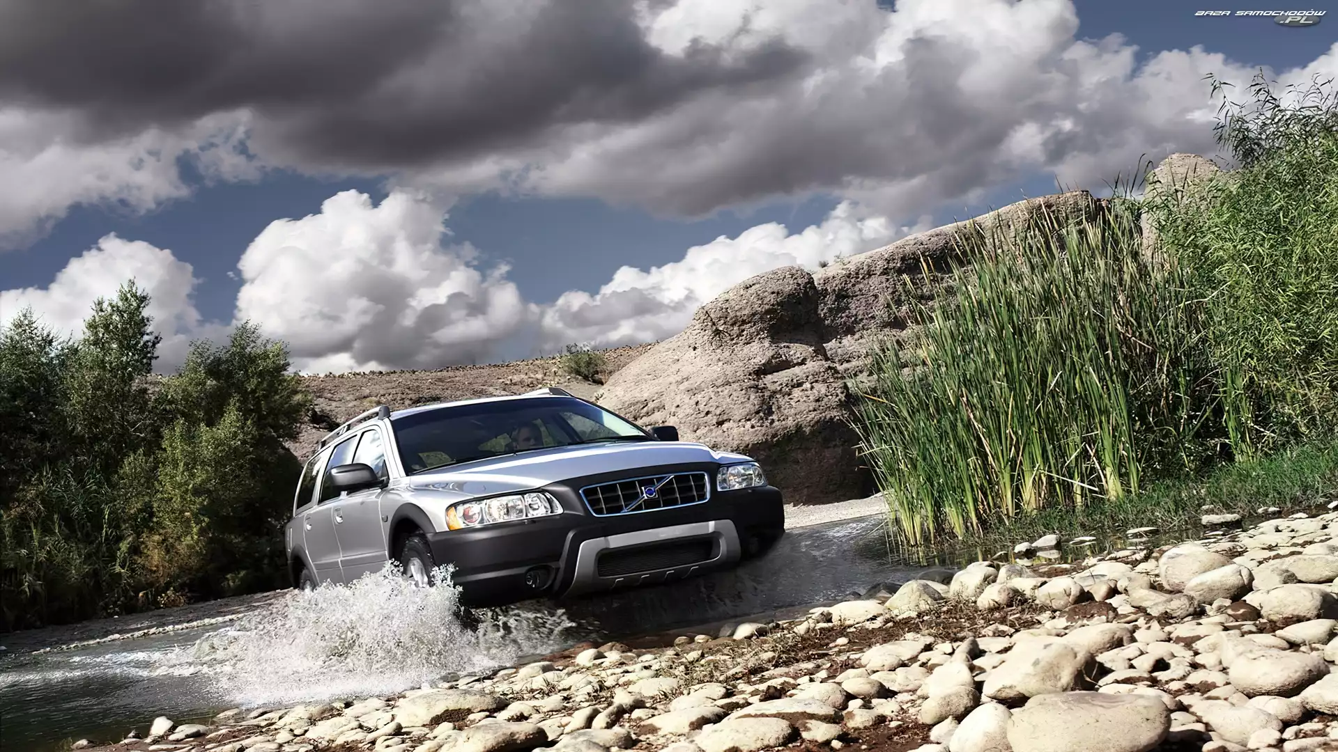 Samochód: Chmury, Skały, Samochód, Trzciny, Rzeka, XC70, Volvo, Kamienie